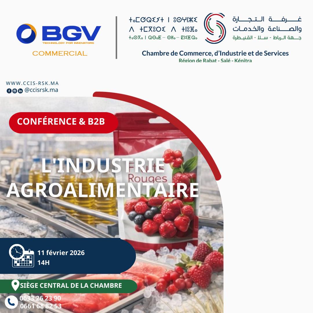 11-02-2026 : La CCIS de Rabat-Salé-Kénitra et le Groupe Italien BGV abrite une Rencontre d’affaires B2B dédiée à l’industrie agroalimentaire avec des partenaires italiens.